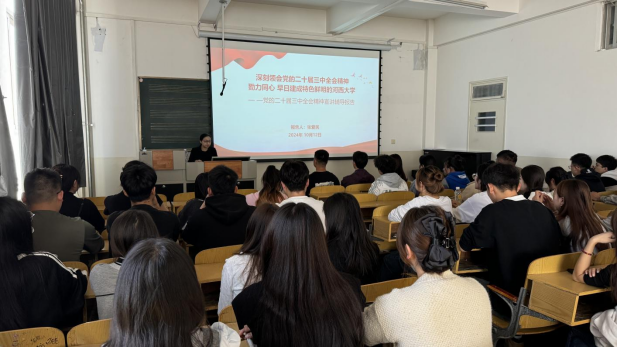 报告指出,学习贯彻党的二十届三中全会精神是当前和今后一个时期的重大政治任务,学院学生要把学习宣传贯彻全会精神作为党的创新理论武装工作的一项重大任务,利用党团主题活动,结合专业课学习,深刻领悟党的二十届三中全会精神的实质和丰富内涵,要原原本本、逐字逐句加强学习,要深刻理解内涵,准确把握外延,要在学思践悟中坚定理想信念,在实践笃行中厚植爱国情怀。